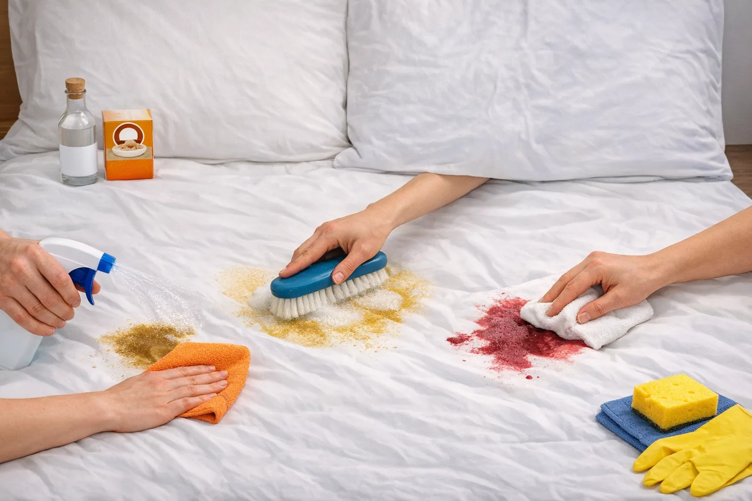 - پاکسازی موضعی قبل از شستوشوی کامل: پیش از شستن کامل پوشش خواب، ابتدا لکهها را بهصورت موضعی برطرف کنید. این کار از پخش شدن لکه در زمان شستوشو جلوگیری میکند و نتیجه بهتری به همراه دارد.